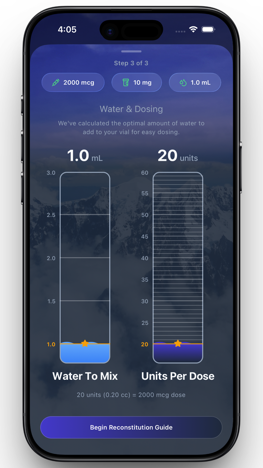 Input your vial amount, get exact measurements. No more mg vs mcg confusion.